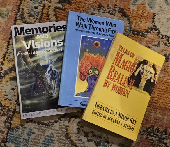Zee was just starting to edit anthologies, often of women’s writing; by now she has edited a gazillion and branched out into offering writers’ workshops. Back then, however, she opened the way for me to edit three anthologies of women’s f/sf for Crossing: Memories and Visions (1989), The Women Who Walk Through Fire (1990), and Tales of Magic Realism by Women (Dreams in a Minor Key) (1991).